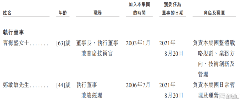 曹梅盛今年63岁,为公司的联合创始人、董事长、执行董事兼首席技术官。她于1982年7月毕业于中国杭州化学工业学校(现称浙江工商大学),并于2018年6月获得位于中国的电子科技大学机电一体化专业(在线课程)大专文凭。