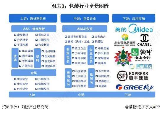包装行业上游原材料及包装设备行业中,通用塑料行业代表企业有金发科技、沃特新材料、国恩科技等,包装用纸行业代表企业有玖龙纸业、理文造纸、太阳纸业和山鹰纸业等,包装玻璃行业代表企业有山东药玻、正川股份、旗滨集团等;中游包装行业纸质包装行业代表企业有上峰集团、利乐包装、锦胜包装等,金属包装行业代表企业有中粮包装、昇兴集团、奥瑞金科技等;下游各应用市场主要有家电企业美的集团、格力电器等,食品企业北大荒等,以及其他应用市场企业。中国包装产业链生态图谱如下图表所示: