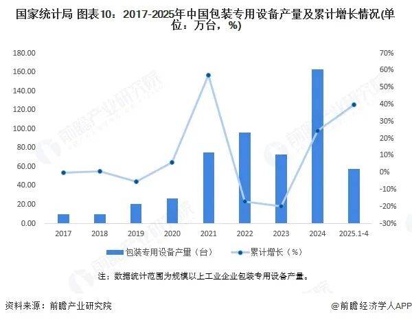 我国包装行业经过几十年来的发展,在制造规模和工艺水平上取得了较大的进步,满足了各个领域的高速发展。2017-2024年,中国包装规模以上企业数量不断增加,包装专用设备累计产量增长迅速。据国家统计局数据,2024年,全国包装专用设备行业累计完成产量163.25万台,同比增长24.5%。截至2025年4月,全国包装专用设备行业累计完成产量57.95万台,同比增长39.9%。