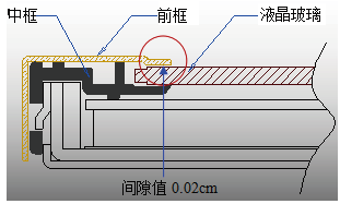 对策②中,通过加高中框的支撑面而使得玻璃与前框的间隙加大,这样,在整机装配中,面壳台阶与液晶玻璃的间隙加大,避免了面壳台阶直接压迫液晶玻璃,在实际的试验中,对策②解决了漏光现象。